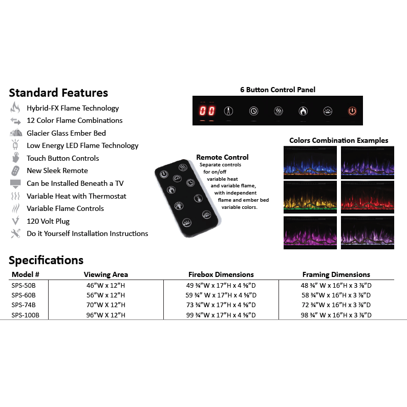 The Spectrum Slimline features high-intensity flame and ember bed lighting showcasing new Hybrid-FX™ flame technology independently controlled with 12 different color options. Other standard features include variable & thermostatic heat, variable motor controls, timer, push button and remote controls. All these features make the MODERN FLAMES SPECTRUM SLIMLINE ELECTRIC FIREPLACE the perfect electric fireplace for you!