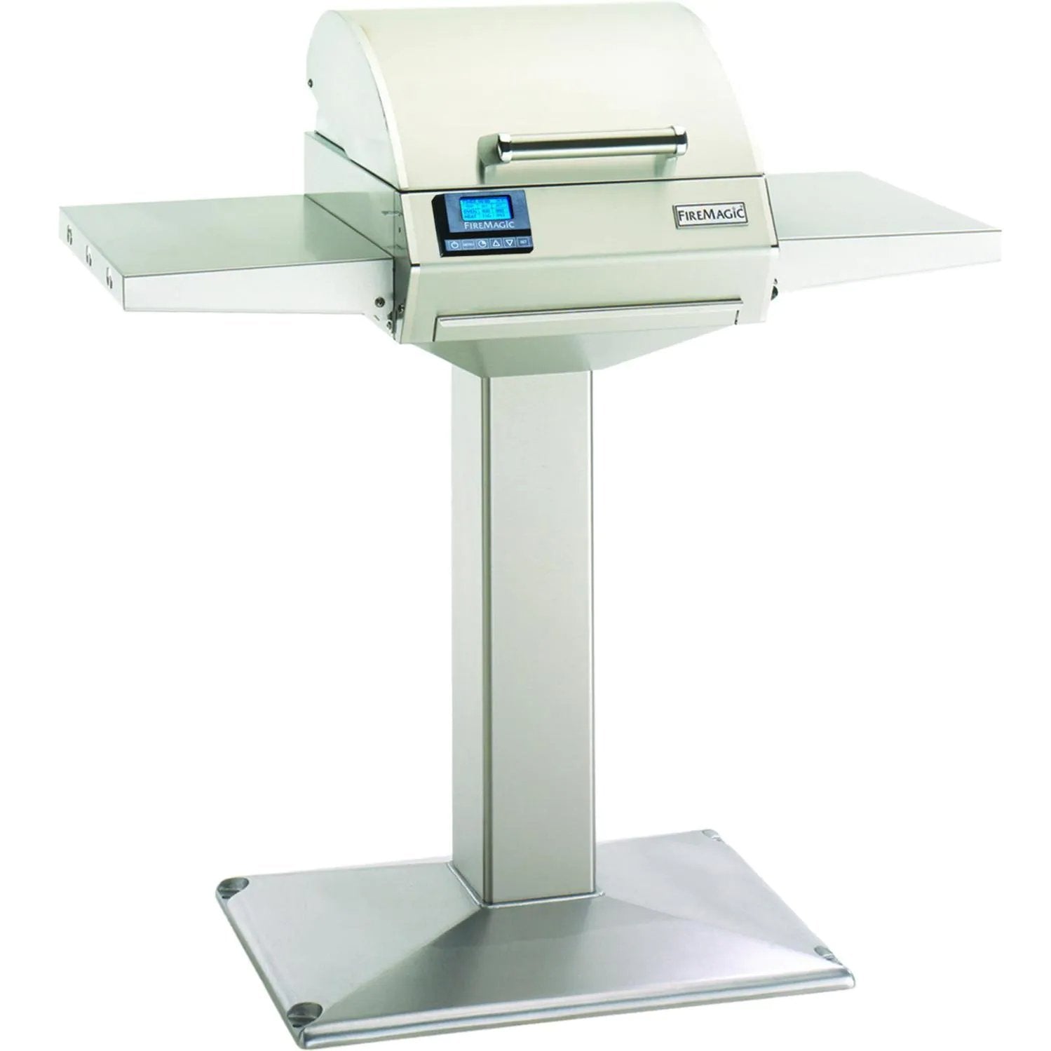 This Fire Magic Electric Grill features a large heating element for faster and hotter cooking. The grill reaches temperatures up to 725 degrees Fahrenheit and offers a triple wall insulated body and double wall lid for maximum heat concentration. Easily control your cooking temperature with the precision thermostatic control system which keeps the internal temperature within 20 degrees of the desired setting and has a 2-hour safety shut-off. The included meat probe lets you monitor the internal temperature of your food and an alarms sounds when the desired temperature is reached. This grill comes with a removable warming rack and drip tray making clean up a breeze. Fire Magic Electric Grills are perfect for boats, condos and apartment balconies where open flame is prohibited. This Fire Magic Electric BBQ features a 252 square inch grilling area and two 12 W x 20 D side shelves. It operates on a 110V, 20 amp circuit. This Fire Magic Grill comes on a patio post and will not function in temperatures below 40 degrees Fahrenheit.
