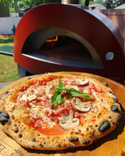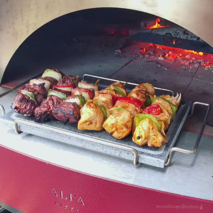 Hand crafted in Italy, Alfa pizza ovens combine old world methods with the latest technology to meet the needs of any at home chef. The Allegro pizza oven uses patented Alfa Forninox technology to reach desired cooking temperatures with very little fuel in as little ten minutes. Cook up to five pizzas at a time on the 39 3/8 x 27 9/16 inch fire brick cooking surface. Placing the food next to the fire gives it the flavor and aroma of wood. The yellow dome is made of powder-coated stainless steel and the cooking floor is made of refractory material to help retain heat while cooking. The high, arched shape of the dome allows the heat to remain trapped and cook food evenly while the built-in thermometer allows you to monitor internal temperatures. With no curing needed, you can cook anything in your Alfa pizza oven that you would normally cook in your kitchen oven including roasts, vegetables, desserts and more. The oven base features a black powder-coated finish for durability, cart wheels for portability, a food warming shelf below the combustion chamber, a bottom shelf for storing extra wood and two side-shelves that fold down to save space.