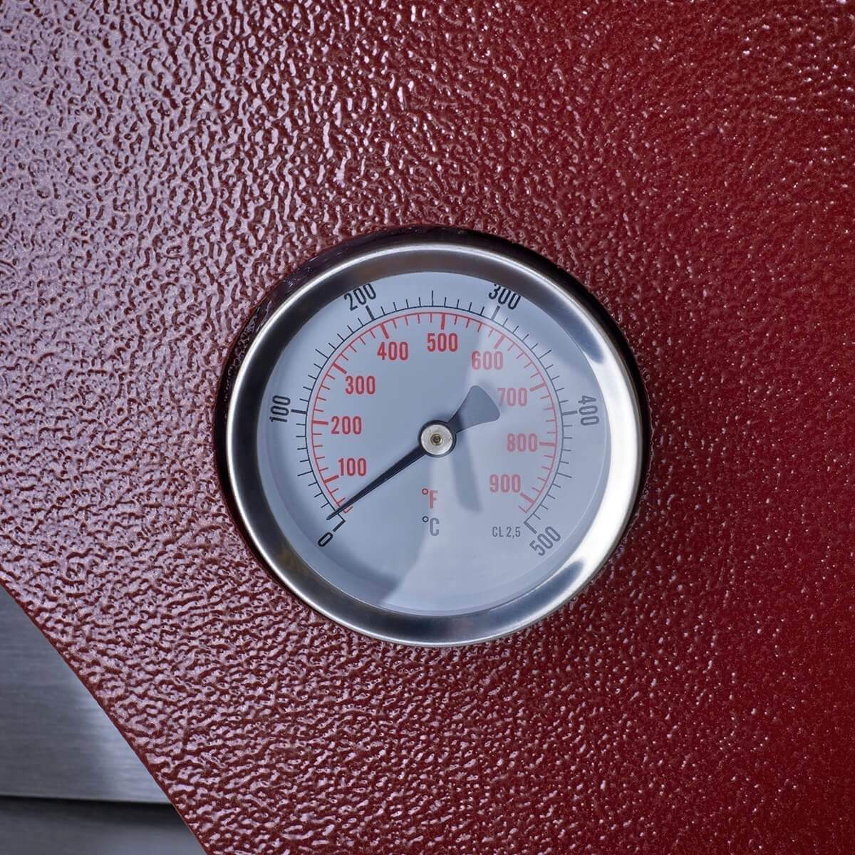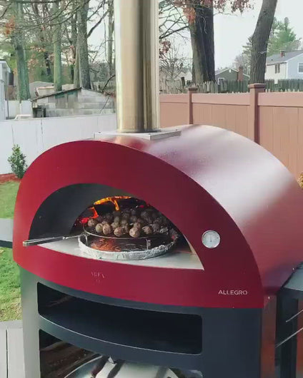 Hand crafted in Italy, Alfa pizza ovens combine old world methods with the latest technology to meet the needs of any at home chef. The Allegro pizza oven uses patented Alfa Forninox technology to reach desired cooking temperatures with very little fuel in as little ten minutes. Cook up to five pizzas at a time on the 39 3/8 x 27 9/16 inch fire brick cooking surface. Placing the food next to the fire gives it the flavor and aroma of wood. The red dome is made of powder-coated stainless steel and the cooking floor is made of refractory material to help retain heat while cooking. The high, arched shape of the dome allows the heat to remain trapped and cook food evenly while the built-in thermometer allows you to monitor internal temperatures. With no curing needed, you can cook anything in your Alfa pizza oven that you would normally cook in your kitchen oven including roasts, vegetables, desserts and more. The oven base features a black powder-coated finish for durability, cart wheels for portability, a food warming shelf below the combustion chamber, a bottom shelf for storing extra wood and two side-shelves that fold down to save space.