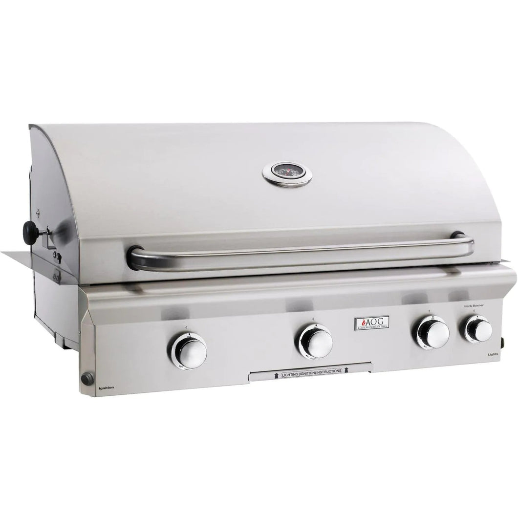 The American Outdoor Grill built-in collection is designed for long-lasting, unsurpassed performance that produces unbelievable flavor. All AOG built-in grills boast a stylish, sleek appearance, including the beautiful double-layered satin finish hood, stainless steel construction, and custom-designed analog thermometer with polished bezel. Proudly made in the USA and built to last, this AOG L-Series natural gas grill features commercial grade 304 series stainless steel construction, long-lasting stainless cooking grids and heavy-duty warming rack, and highly-sophisticated stainless steel 50,000 BTU U-shaped burners with integrated support posts for performance and durability. If you enjoy grilling veggies, steaks, and chicken any time you want, the first things you will appreciate are the electronic push button ignition and brand-new interior halogen lighting - perfect for night grilling and powered by a right-side push button and 120 volt connection. Other great features on this grill include 648 sq inches of primary grilling space, stainless steel vaporizer panels (also called flame tamers) for even heat distribution, solid brass valves with black-flared front knobs for precise temperature control and longer life, and a funneled grease management system with slide-out drip tray for painless clean up. Roast a better bird with the high performance rotisserie kit with 12,000 BTU infrared back burner. Whether you enjoy entertaining the neighbors or rounding up the family for a fresh meal, this AOG 36-inch L-Series gas grill will add style and cooking excellence to compliment your outdoor lifestyle.