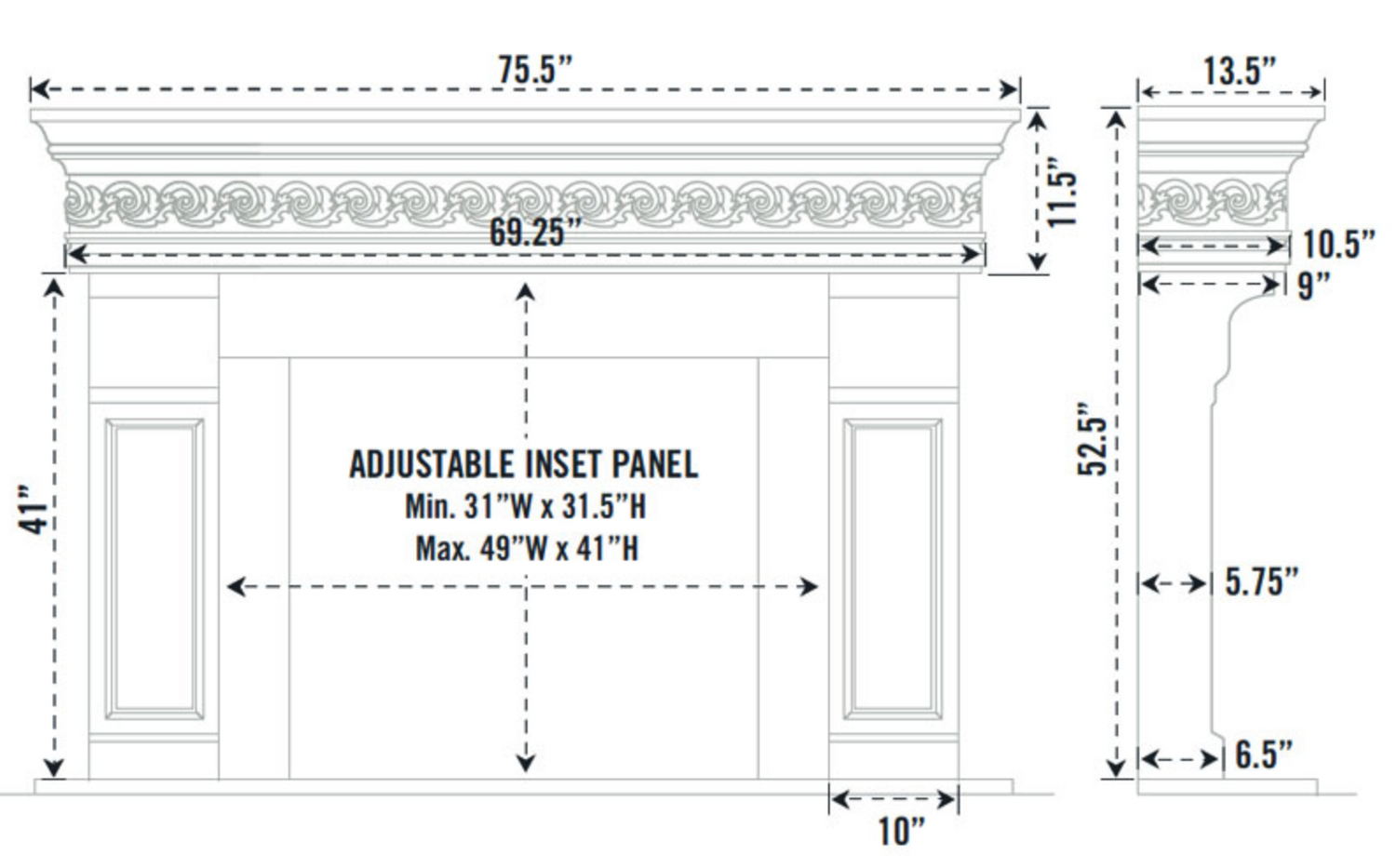 This mantel comes as shown in the dimension picture. However, our product can be customized to different sizes and finishes on demand. This mantel is only the tip of the iceberg of what Omega Mantels can create for you, we can adapt to every project. Our job is to assist you with the design to match your dream ideas to your existent wall.