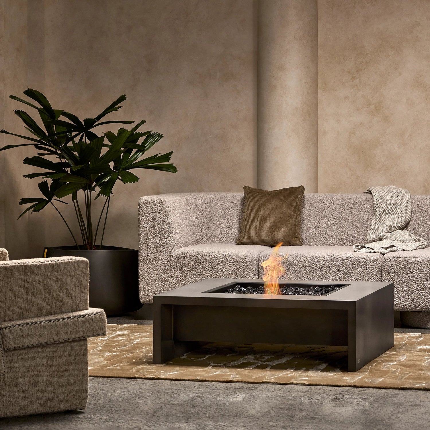 - Modern square design functions as both a fire pit and a spacious coffee table centerpiece.