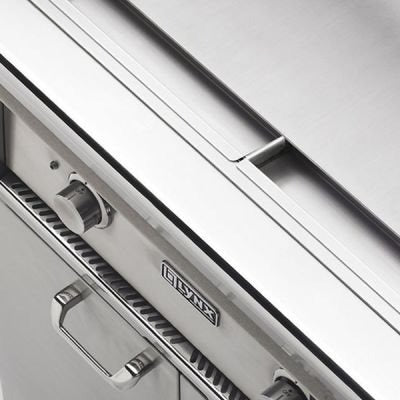 Experience the finest in outdoor grilling performance with the superior craftsmanship and innovative features found in this 30-inch Asado BBQ grill from Lynx. The quality begins outside with gleaming, high-grade 304 stainless steel that is seamlessly welded to eliminate areas where grease and moisture can collect. The L30AG-NG natural gas grill features a multi-layer All-Clad aluminum griddle cooktop sandwiched between two sheets of stainless steel for even heat distribution. Unique and versatile, this grill will inspire creations from stacks of buttermilk pancakes to sizzling fajitas and grilled chorizo sausage over the 495 square inch cooking area. Underneath the cooking surface, two 23,000 BTU Lynx Trident adjustable infrared burners allow you to cook over two independent cooking zones. An advanced ignition system uses a hot element positioned directly above the burner port for reliably safe start-up with a flash tube backup lighting system. Like to grill into the night? The adjustment knobs on the control panel sport blue LED accent lights for precise control. The Asado also includes a stainless steel cover to protect the cooking surface when not in use.