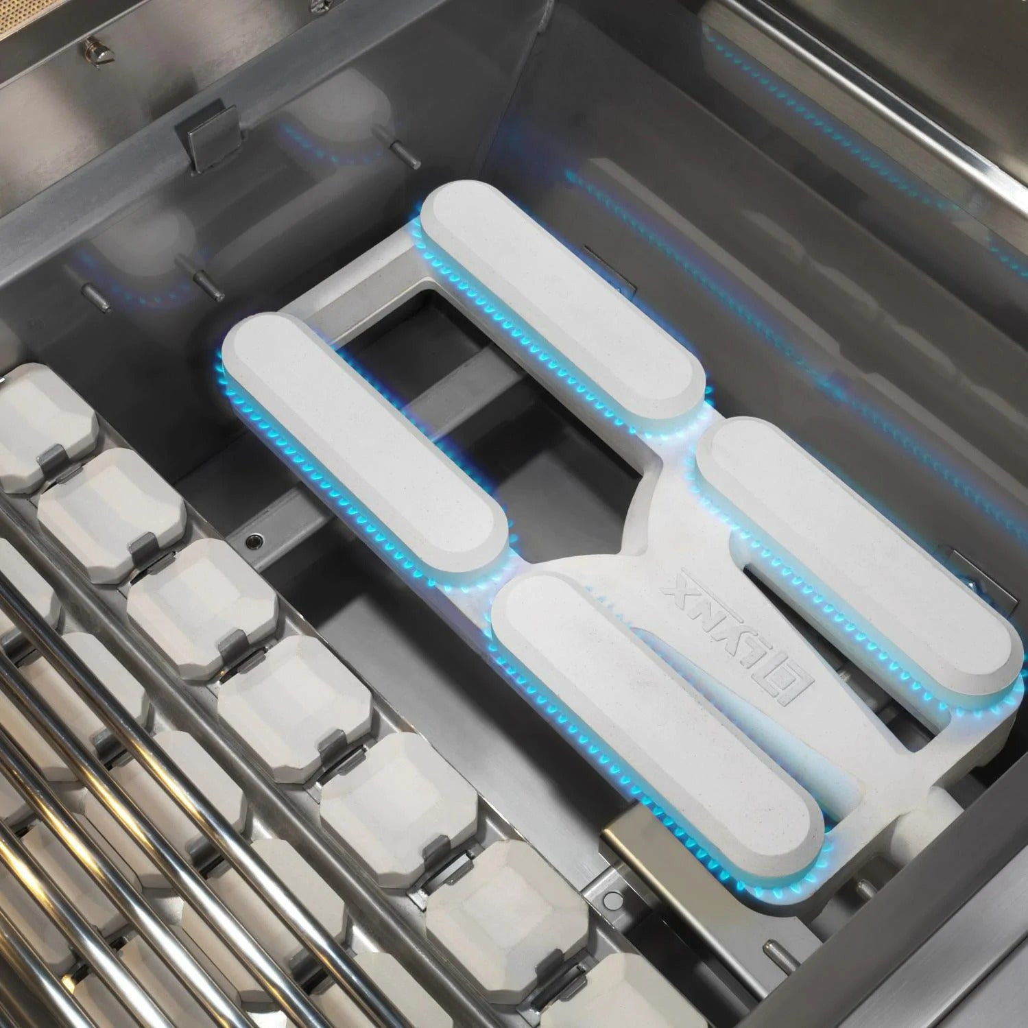 Experience the finest in outdoor grilling performance with the superior craftsmanship and innovative features found in this 36-inch propane gas BBQ grill from Lynx. The quality begins outside with gleaming, high-grade 304 stainless steel that is seamlessly welded to eliminate areas where grease and moisture can collect. A patented design deflects wind and allows the grill to vent properly, stabilizing critical surface temperatures when cooking in windy conditions. Inside, a 23,000 BTU Lynx Trident adjustable infrared burner allows you to sear thick-cuts perfectly or lower the temperature to cook more delicate items. Two 25,000 BTU ceramic burners deliver superior heat retention and delivery and will never rust or corrode. The three burners push 73,000 BTUs of total cooking power on the grilling surface. An advanced ignition system uses a hot element positioned directly above the burner port for reliably safe start-up and a large capacity smoker box allows you to add extraordinary flavor to all the things you like to grill. Over the burner, an array of fixed position ceramic briquettes ensures precise, even heat distribution to the 640 square-Inch main cooking grid while a secondary grid provides an additional 295 square-inches for a comprehensive 935 square-inches of overall grilling space. The Lynx L36TRF-LP also has a dual-position internal rotisserie with heavy-duty, 3-speed motor and rear infrared burner to raise your cooking options to their full potential. Lynx made sure you have easy access to all these fine cooking features by adding lift assist and a handle that rotates fluidly as you raise and lower the hood. Like to grill into the night? The adjustment knobs on the control panel sport blue LED accent lights for precise control and ultra-bright internal halogen lights illuminate the grilling surface eliminating guess-work. This Lynx grill on cart serves as a complete mobile outdoor kitchen with two heavy duty swing-out cart doors, magnetic latches and condiment shelves that are removable for easy cleaning. Commercial-grade casters make the unit easy to move and shelves can be folded down out of the way. Proudly made in the USA. Bring the power and performance of Lynx innovation to your outdoor cooking with the L36TRF-LP Propane Gas Grill on Cart.