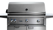 Superior craftsmanship and innovative features deliver everything you would expect and more in this 42-inch natural gas BBQ grill from Lynx. The quality begins outside with gleaming, high-grade 304 stainless steel that is seamlessly welded to eliminate areas where grease and moisture can collect. A patented design deflects wind and allows the grill to vent properly, stabilizing critical surface temperatures when cooking in windy conditions. Inside, a 23,000 BTU Lynx Trident adjustable infrared burner allows you to sear thick-cuts perfectly or lower the temperature to cook more delicate items. Two 25,000 BTU ceramic burners deliver superior heat retention and delivery and will never rust or corrode. The three burners push 73,000 BTUs of total cooking power on the grilling surface. An advanced ignition system uses a hot element positioned directly above the burner port for reliably safe start-up and a large capacity smoker box allows you to add extraordinary flavor to all the things you like to grill. Over the burner, an array of fixed position ceramic briquettes ensures precise, even heat distribution to the 855 square-Inch main cooking grid while a secondary grid provides an additional 345 square-inches for a comprehensive 1,200 square-inches of overall grilling space. The Lynx L42TRF-NG also has a dual-position internal rotisserie with heavy-duty, 3-speed motor and rear infrared burner to raise your cooking options to their full potential. Lynx made sure you have easy access to all these fine cooking features by adding lift assist and a handle that rotates fluidly as you raise and lower the hood. Like to grill into the night? The adjustment knobs on the control panel sport blue LED accent lights for precise control and ultra-bright internal halogen lights illuminate the grilling surface eliminating guess-work. This Lynx grill on cart serves as a complete mobile outdoor kitchen with two drawers, a heavy duty swing-out door, magnetic latches and condiment shelves that are removable for easy cleaning. Commercial-grade casters make the unit easy to move and shelves can be folded down out of the way. Proudly made in the USA. Bring the power and performance of Lynx innovation to your outdoor cooking with the L42TRF-NG Natural Gas Grill on Cart.