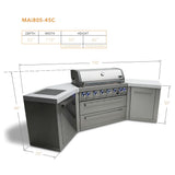 The MAi805-45 features six standard-sized burners, an infrared side burner, and an infrared rear burner for superior rotisserie cooking capabilities. The 45-degree angle modules provide extra prep space and create a striking appearance on your patio or yard.