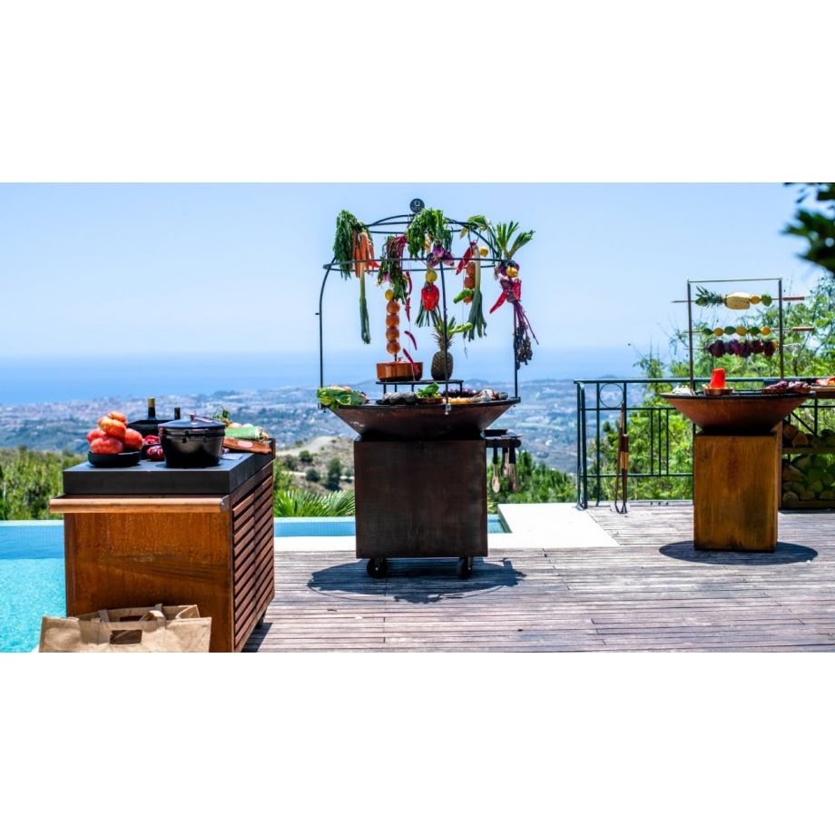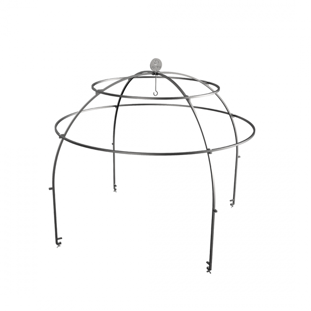 The OFYR Cage is the perfect accessory for professionals who love to show cook. Its dome-like structure allows food to be suspended from the steel beams, creating a unique and interactive visual element. The heat from the fire slowly cooks ingredients, from meat and fish to fruits and vegetables. Since the Cage is secured on the outer edge of the plate, the cooking surface remains free to prepare other dishes. Ingredients can be suspended from the beams with skewers and s-hooks.