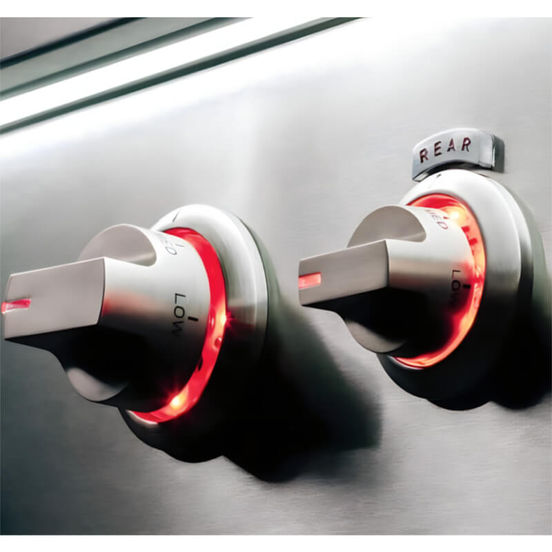 • New exterior LED strip light with white & red bezel lighting indicates if burners are off/on.