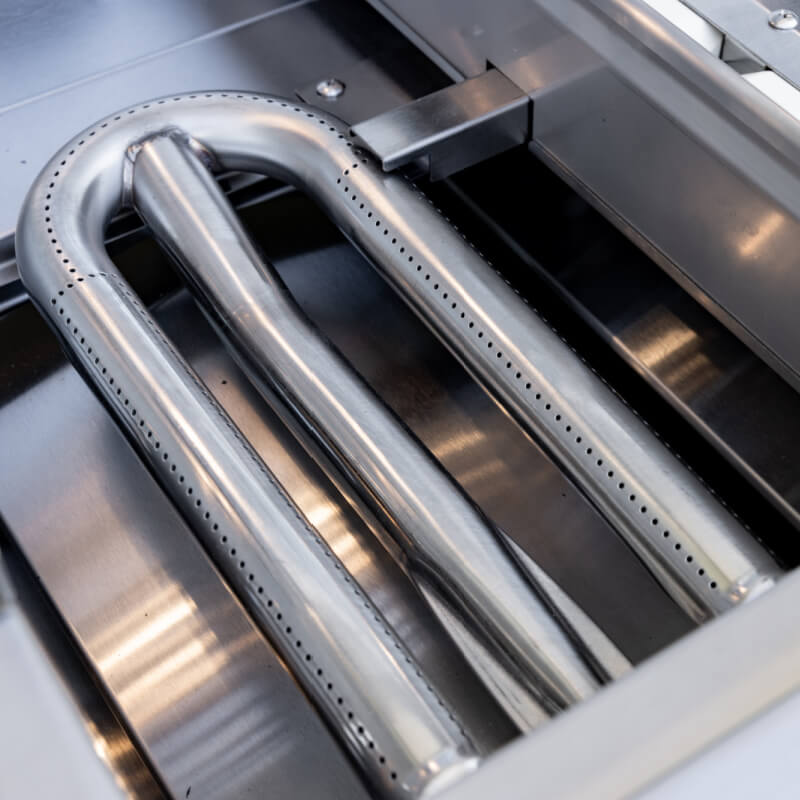 - Four (4) 304 stainless steel U-tube burners deliver 20,000 BTUs each, for a total of 80,000 BTUs of consistent grilling power.
