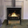 - Preassembled interior with black porcelain panels and mature fire logset