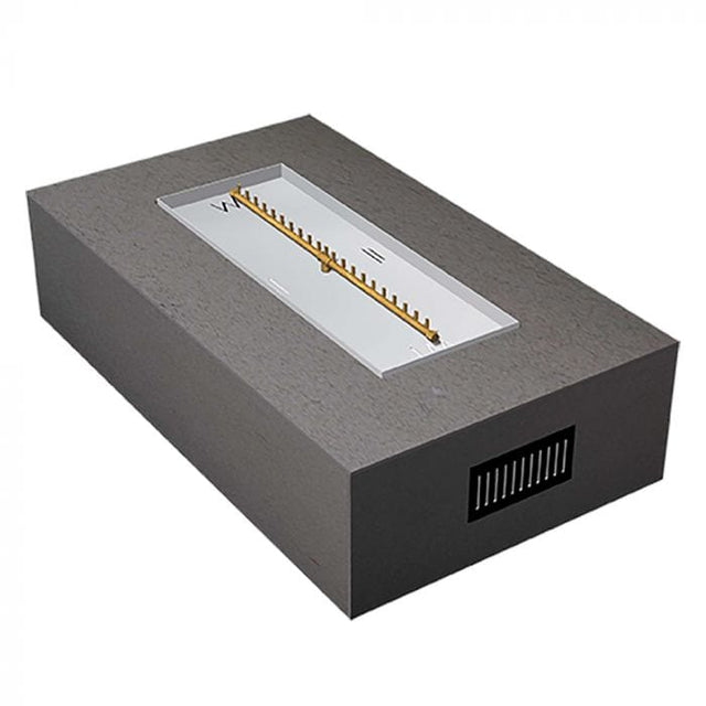 This 72x42" Rectangular Ready To Finish Kit includes a heavy-duty aluminum frame surrounded by a concrete hardi board to complete the basic structure of the enclosure. The 72x42x18-inch rectangular enclosure consists of a 48x18-inch rectangular aluminum pan with 2-inch sidewalls and a 42-inch Linear Crossfire Burner rated at 210,000 BTU that can be specified for either propane or natural gas.
